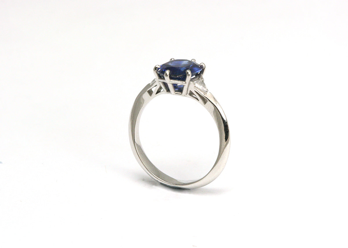 We came up with a design that combines the spaceframe chassis of the car with an Art Deco look featuring a 1.79ct sapphire and flanking triangular diamonds, in platinum....