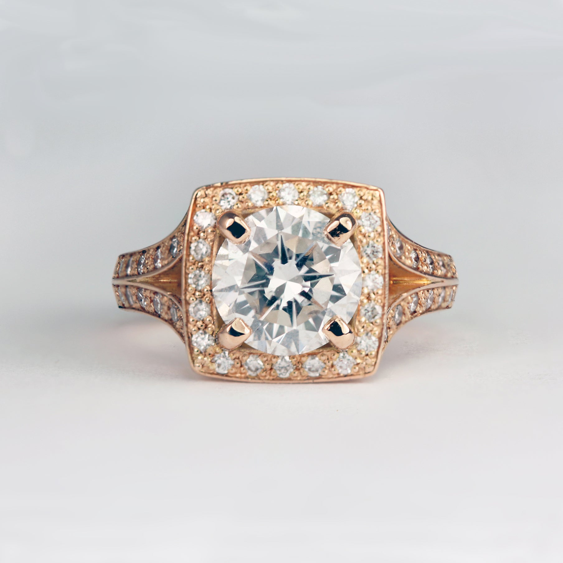 We were commissioned to make a bespoke engagement ring to fit a customer's existing 2ct E VS1 diamond. We came up with this elegant Art Deco style setting in 18ct rose gold and added some small micro-pave diamonds...